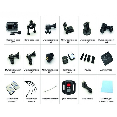 У комплекті також ви знайдете масу різних кріплень для боксу екшн-камери, за допомогою яких ви зможете використовувати камеру в різних ситуаціях, прикріпивши її на ніс кано або на шолом мотоцикла, наприклад. До речі, кріплення універсальні та сумісні з іншими виробниками. Крім кріплень, ви виявите ізахищений пульт дистанційного керування (IP68 до 2 метрів).
